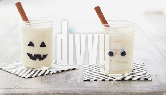 Two RumChata-whiskey Halloween cocktails with a cinnamon stick garnish are served in decorated mummy and jack o'lantern mason jars on a gray surface in front of a white background.