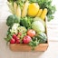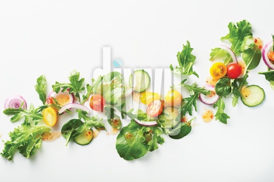 A spread of mixed leafy greens with tomatoes, purple onions and cucumbers is scattered over a white surface and drizzled with vinaigrette dressing.