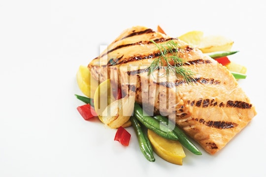 A grilled salmon fillet is served with a dill garnish over cooked vegetables on a white surface.