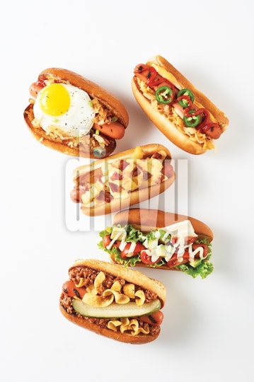 Five gourmet hotdogs are scattered on a white background, featuring toppings such as chili, corn chips, tomatoes, avocado, eggs, jalapeños, cheese, pickle, bacon and more.
