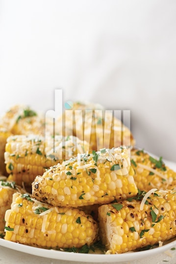 Grilled corn on the cob is finished with butter, Parmesan cheese and chopped parsley.