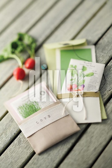 Packets of seed are stored in decorative envelopes next to fresh radishes.