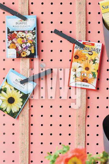 Seed packets are clipped with clothespins to ribbons hung on a pink pegboard that is part of a potting bench.