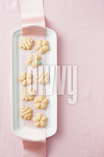 Orange spice spritz cookies sit on a white tray decorated with pink ribbon and coarse sugar.