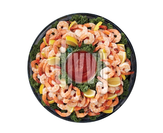 A catering tray is filled with fresh shrimp, lemon wedges and kale garnish with a small bowl of cocktail sauce in the center.
