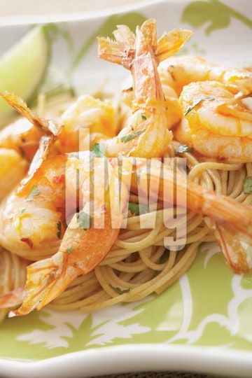 Spicy chili-lime baked shrimp is served on top of whole wheat pasta.