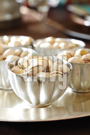 Five silver bowls filled with pistachios arranged on a silver serving tray.