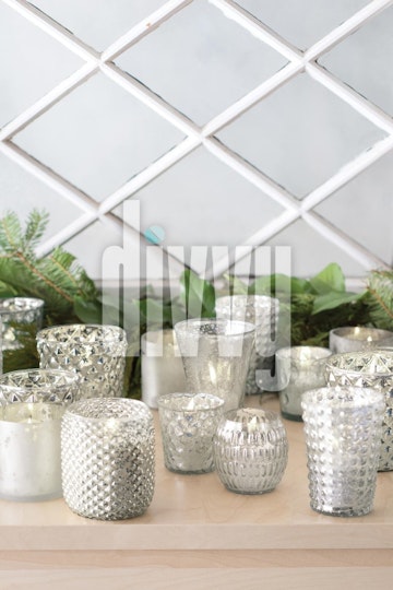 A variety of textured silver candle votives and greenery sit on a wood table with a white lattice background.