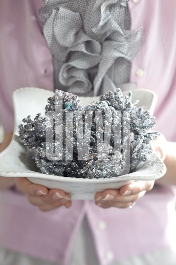 A woman wearing a pink cardigan holds a bowl of silver glitter pinecones.