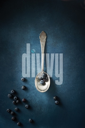 A silver spoon holds blueberries with more scattered on a dark blue surface.