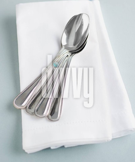 Silver spoons are stacked with a pile of folded white napkins on a light blue table.