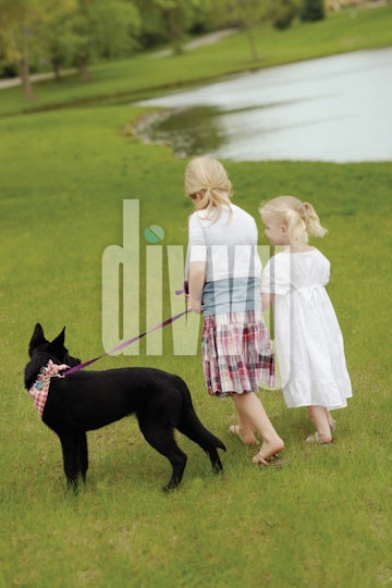 Little Girls Take Dog for a Walk