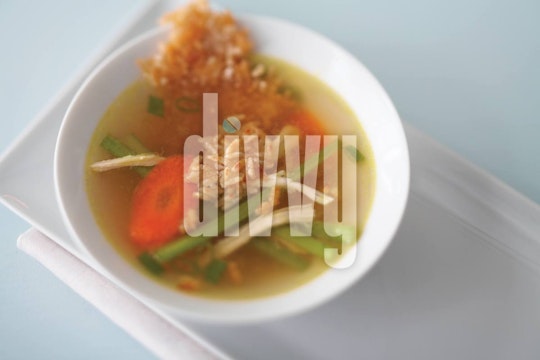 A homemade chicken and fresh vegetable soup is garnished with pieces of toasty fried rice.