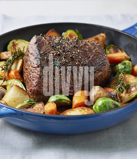 A blue enamel skillet is filled with a black pepper-dusted beef roast and veggies topped with sprigs of fresh rosemary.
