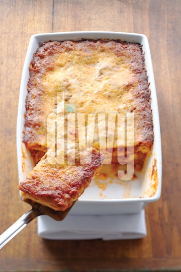 A slice of lasagna is served on a silver spatula from a white casserole dish.