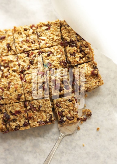 Homemade cranberry trail mix bars are cut on a sheet of parchment paper.