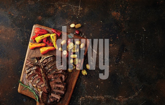 A giant porterhouse steak is sliced off the bone and surrounded on a cutting board by grilled baby potatoes and baby bell peppers.