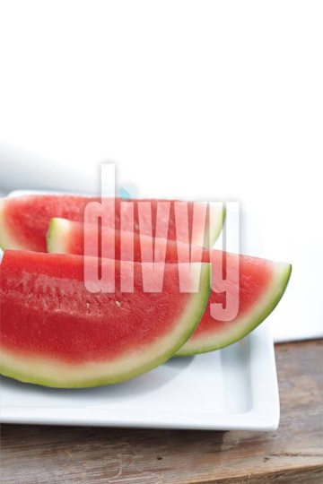 Slices of baby watermelon are served on a white plate at an outdoor party.
