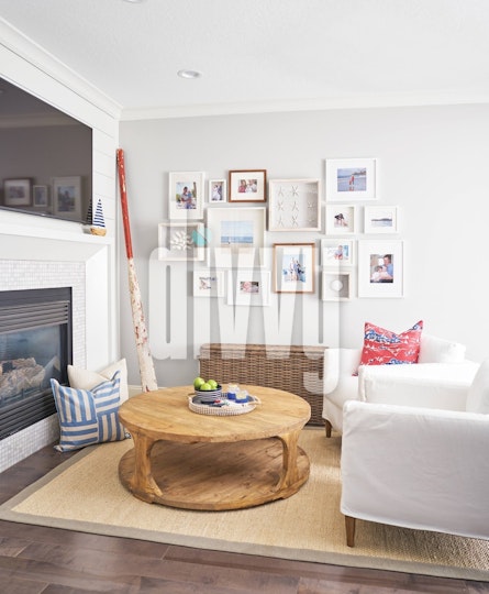 Lounge chairs, a coffee table and a TV are arranged in an intimate seating area in front of a gallery wall.