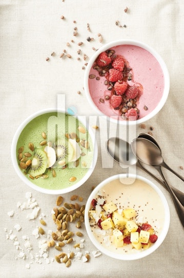 A power green smoothie bowl, a raspberry smoothie bowl and a mango-peach smoothie bowl rest on a linen tablecloth scattered with cacao nibs, pumpkin seeds and coconut flakes.
