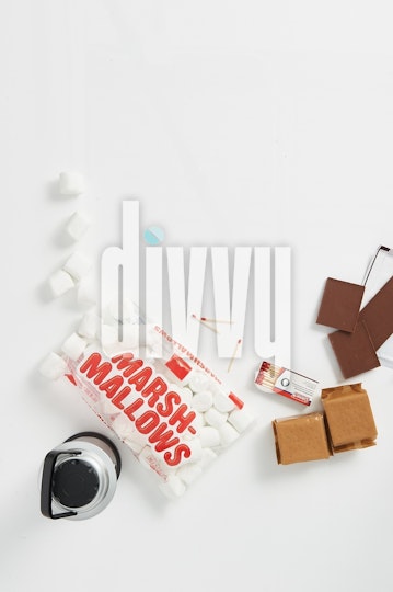 overhead of graham crackers, chocolate, marshmallows and matches on a white surface.