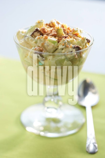 A Snickers salad is served in a footed glass bowl with a spoon on a green tablecloth.