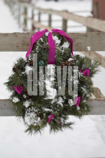 Snow dusts an evergreen wreath wrapped in purple ribbon and hung on a weathered fence.