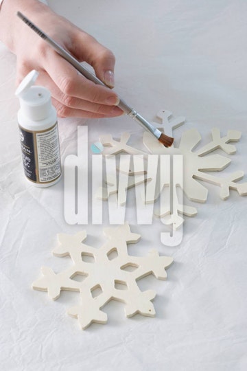 A woman uses a paintbrush to paint a wooden snowflake cutout white.