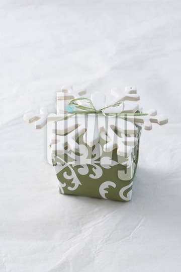 A small box is wrapped in green and white paper and topped with a white wooden snowflake tied on with pale green twine.