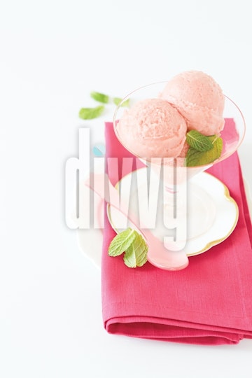 Scoops of pink rhubarb rosé sorbet are garnished with mint leaves and served in a glass cup placed on a magenta napkin with a pink spoon.