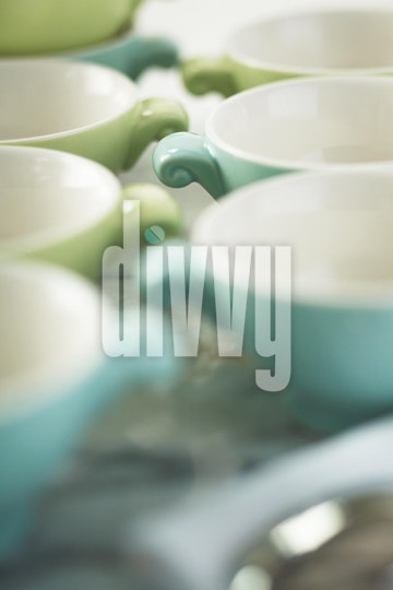The handles of light green and aqua blue soup bowls with white insides are shown lined up, ready to fill with soup for a soup dinner.