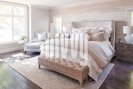 A light, airy master bedroom is filled with a large, beautifully made bed, chaise lounge and two side tables with white lamps.