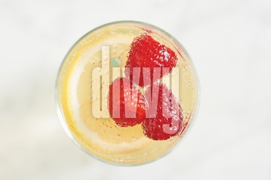 Raspberries and a slice of lemon top a glass of homemade sparkling raspberry lemonade.