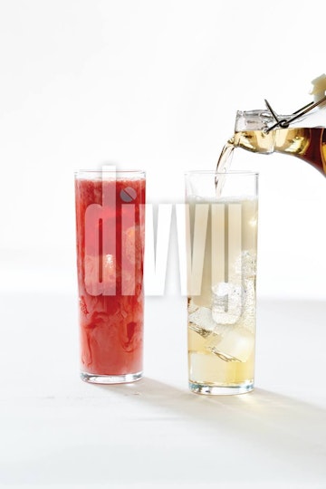 Syrup is poured into a white Italian soda, sitting next to a red Italian soda.