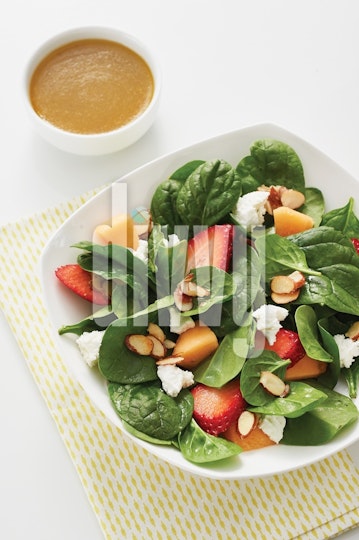 A spinach salad is topped with strawberries, cantaloupe, sliced almonds and goat cheese and served with a classic vinaigrette.