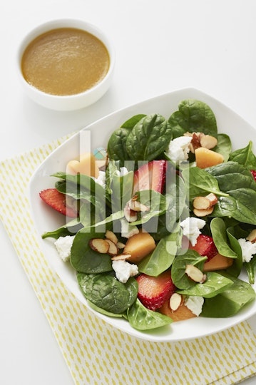 A bowl of spinach salad is topped with sliced strawberries, chunks of cantaloupe, goat cheese and sliced almonds and served on a white and yellow napkin with a small ramekin of vinaigrette.