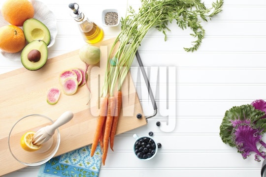 An assortment of healthy produce is ready to prep with a cutting board on a white beadboard surface.