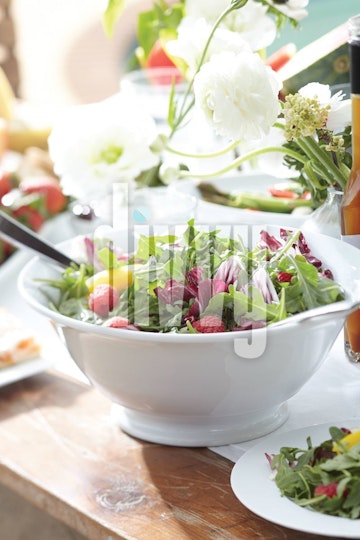 A mango, raspberry and arugula salad is dressed with blood orange vinegar and served on a outdoor table.