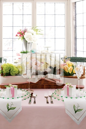 A pink table setting with gifts on plates features a large arrangement of multiple bouquets in a wicker basket in front of large windows.