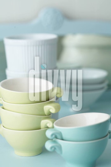 Stacks of light green handled bowls and aqua blue handled bowls are collected with a stack of ramekins and modern white bowls on a pale blue buffet.
