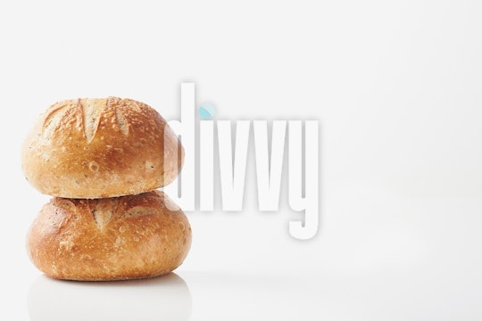 Two rustic sourdough bread loaves are stacked on a white surface.