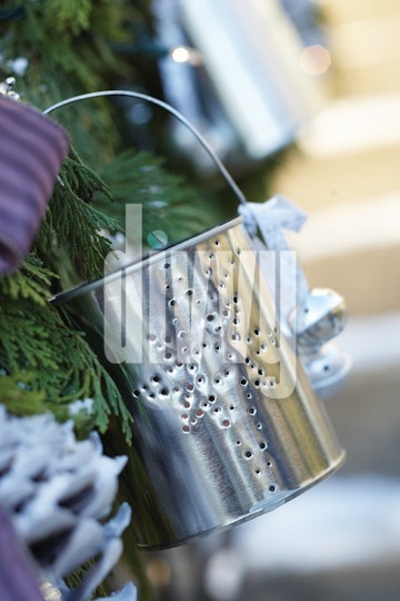 A pierced metal candle holder hangs from an outdoor railing decorated with evergreen branches and frosted pine cones.