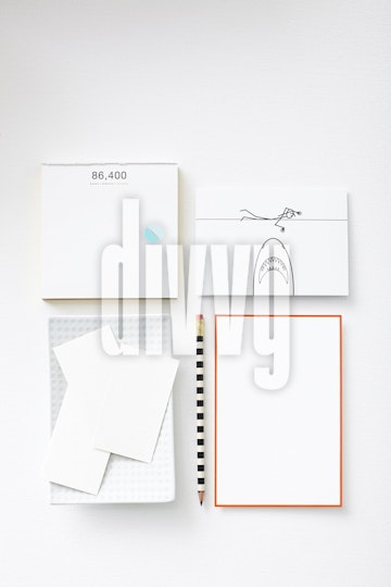 An assortment of papers are arranged in a grid with a striped pencil on a white surface.
