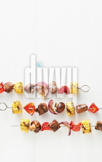 Three steak and veggie skewers rest horizontally on a white-painted wood surface.