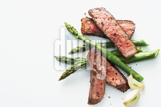 Sirloin steak strips are arranged with asparagus and garlic cloves on a white surface.