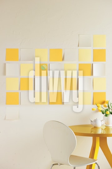 Yellow sticky notes are arranged in a grid on a yellow wall over a side table and flowers