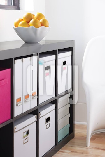 A gray shelving unit in a home office is filled with white cardboard organizers.