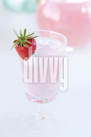 Strawberry lemonade is served with ice and a strawberry garnish.