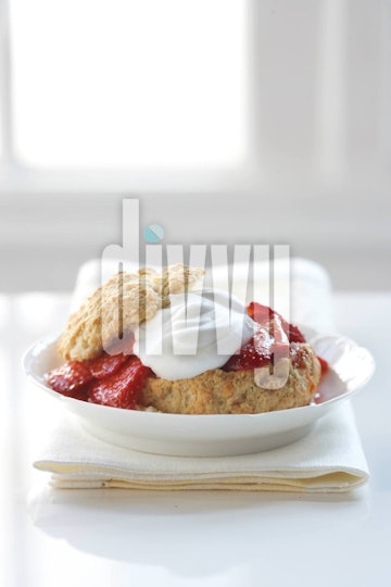 Macerated strawberries and whipped cream fill a split homemade shortcake.