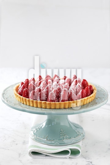 A strawberry tart dusted with powdered sugar is served on a blue cake stand on a marble countertop.